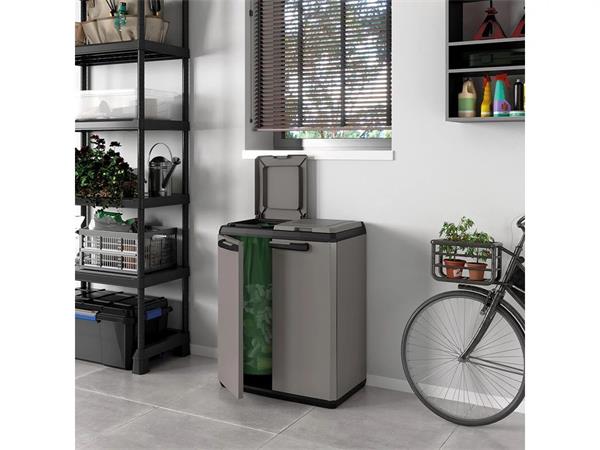A KETER Split szelektív hulladékgyűjtő szekrény intelligens kialakításának és modern, sötétszürke/fekete megjelenésének köszönhetően stílusosan és egyszerűen tesz a környezet védelméért.
